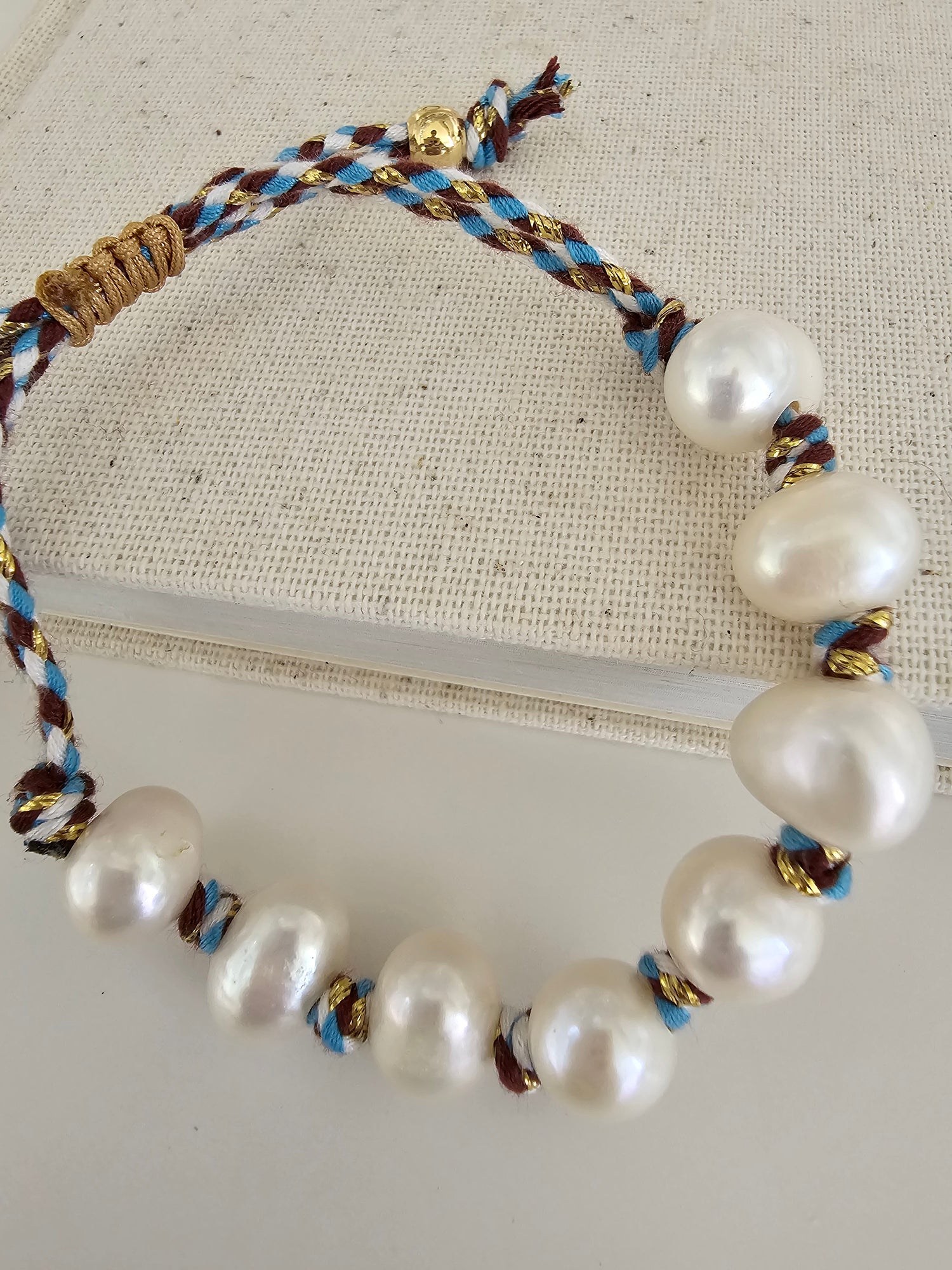 Adjustable nylon cord bracelet with a 10mm (aprox) fresh water pearls.